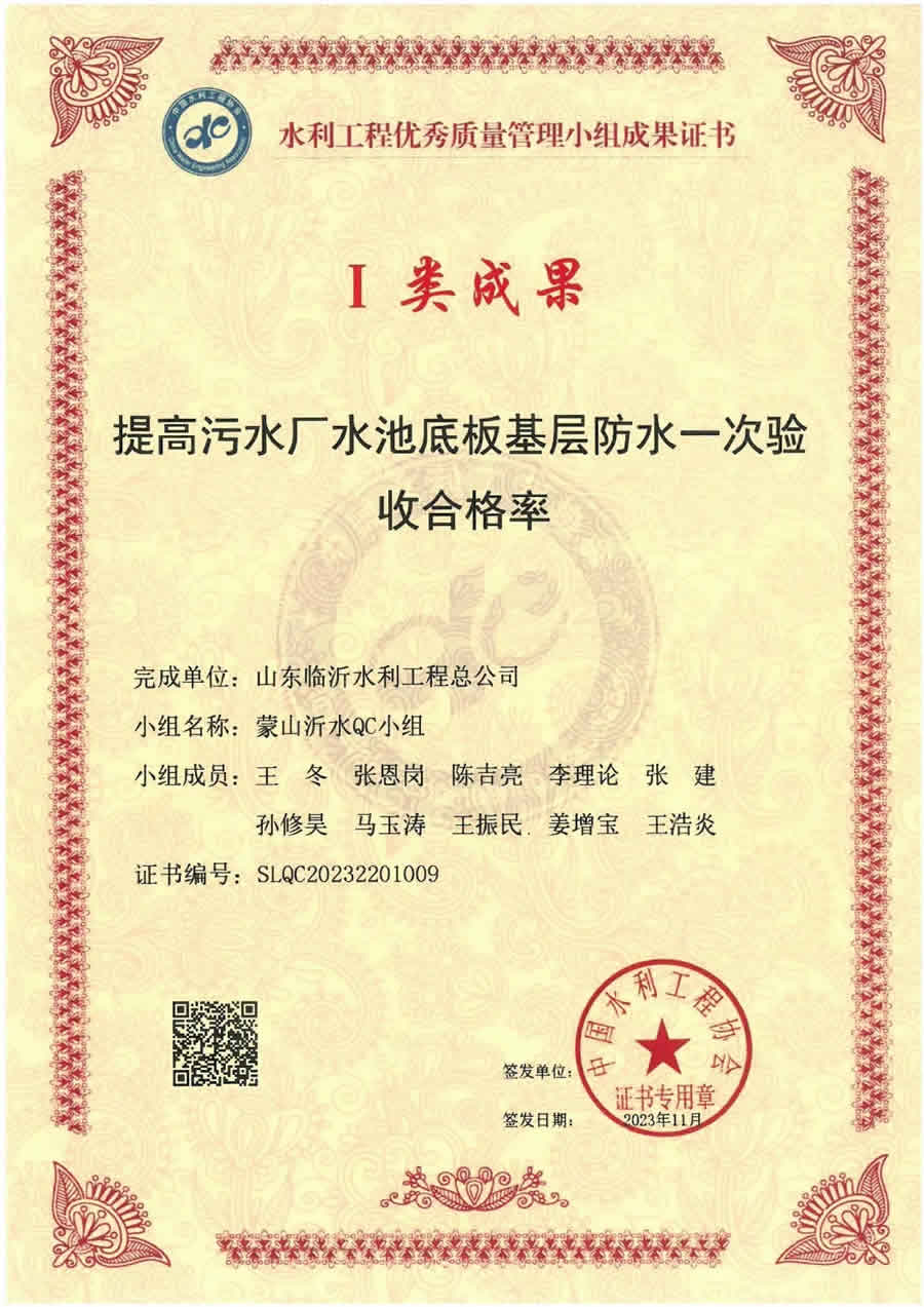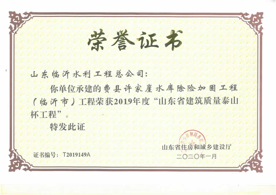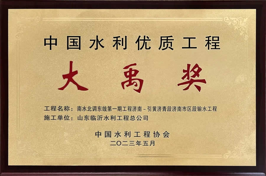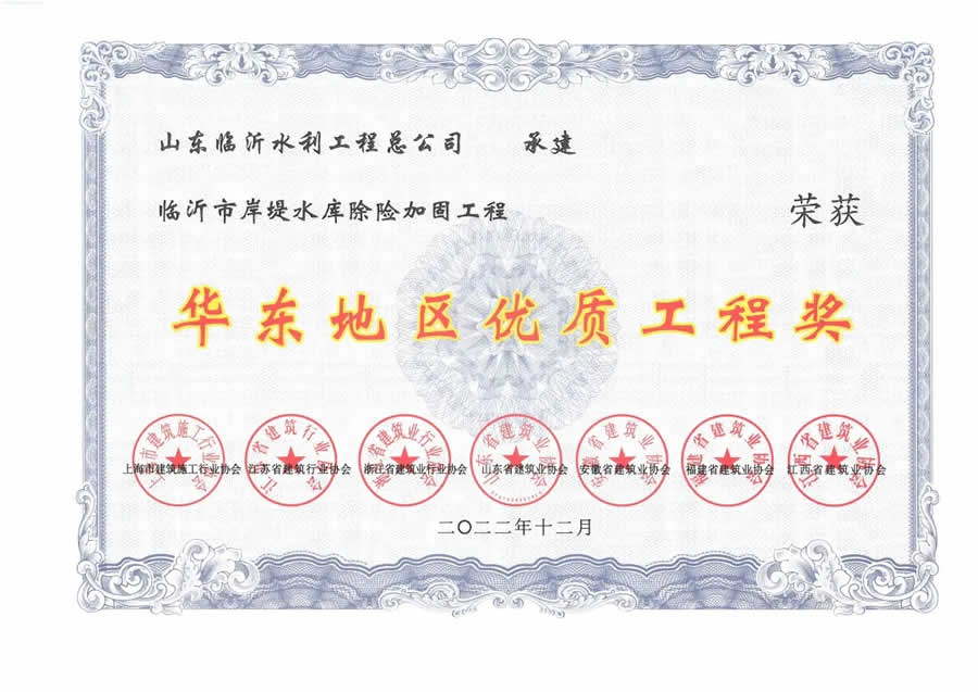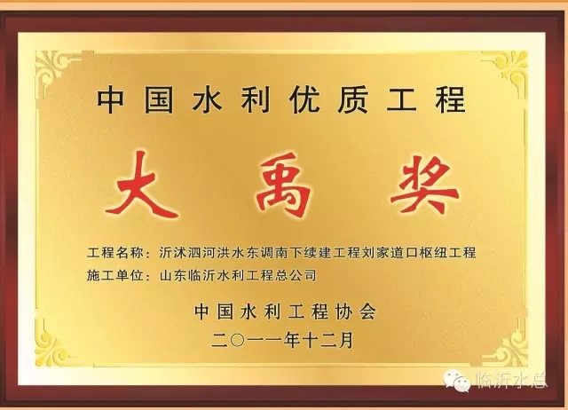 在施工建設(shè)管理過程中,先后榮獲“國家優(yōu)質(zhì)工程金質(zhì)獎(jiǎng)”1項(xiàng)、“中國水利工程優(yōu)質(zhì)(大禹)獎(jiǎng)”2項(xiàng)、“山東省工程建設(shè)泰山杯獎(jiǎng)”8項(xiàng)、“魯水杯優(yōu)質(zhì)水利工程獎(jiǎng)”15項(xiàng)、“華東地區(qū)優(yōu)質(zhì)工程獎(jiǎng)”3項(xiàng),“山東省建筑工程優(yōu)質(zhì)結(jié)構(gòu)”3項(xiàng),臨沂市建設(shè)工程質(zhì)量“沂蒙杯”獎(jiǎng)20項(xiàng)。